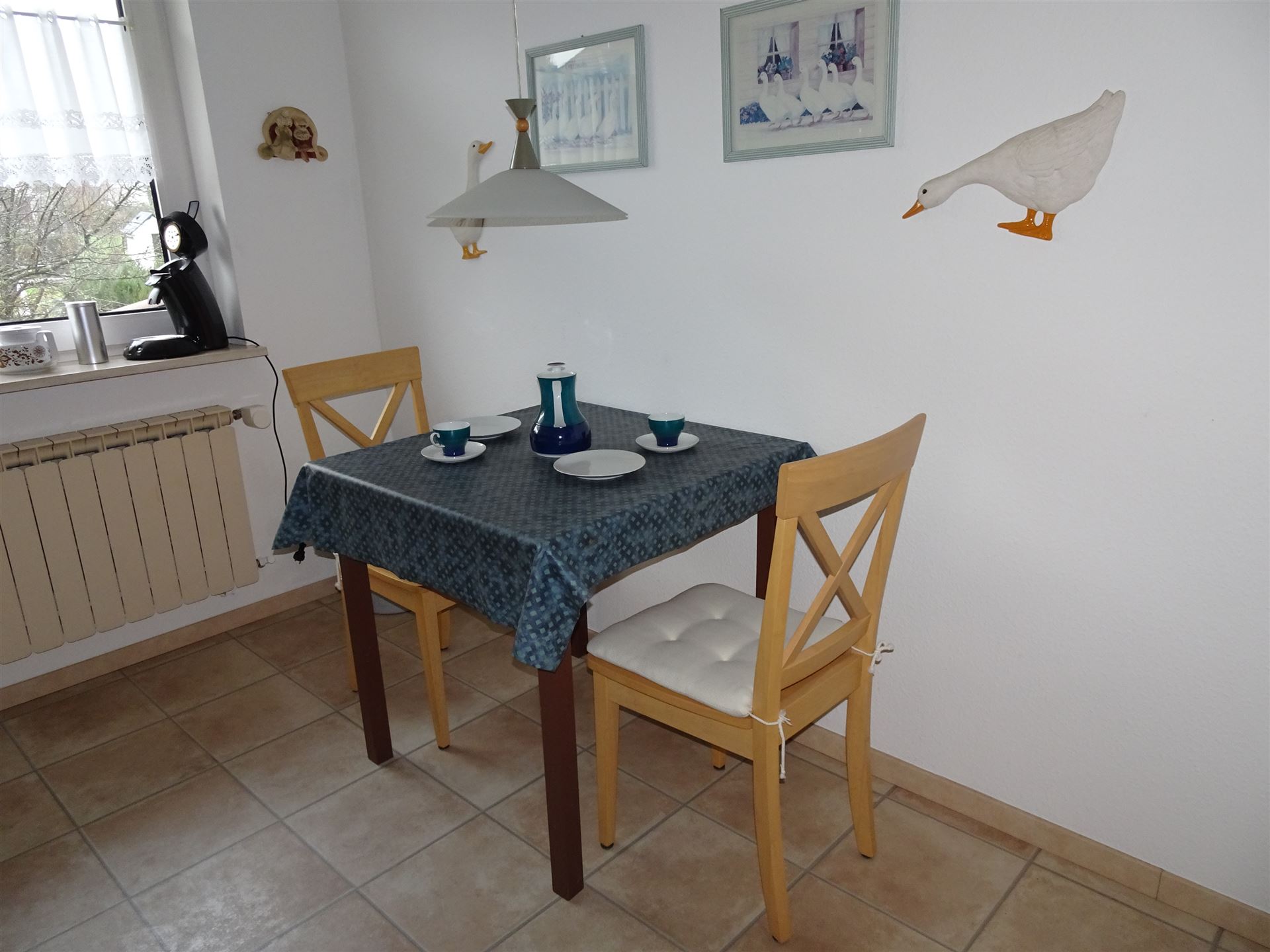 Küche: Die geräumige Küche ist vollständig eingerichtet. Dazu gehören selbstverständlich ein Toaster, Kaffeemaschine, Spüle, Kühlschrank mit großem Gefrierfach, Geschirrspüler, Elektroherd, Backofen, Esstisch und  Stühle.